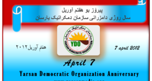 یارسان مدیا سەشنبە، 07 آوريل 2020 گرامی باد ٧ آوریل، روز بنیانگذاری سازمان دمکراتیک یارسان (سدی) در طول صدها سال تعلقات دینی و اتنیکی در تمام شئونات زندگی شهروندان ...