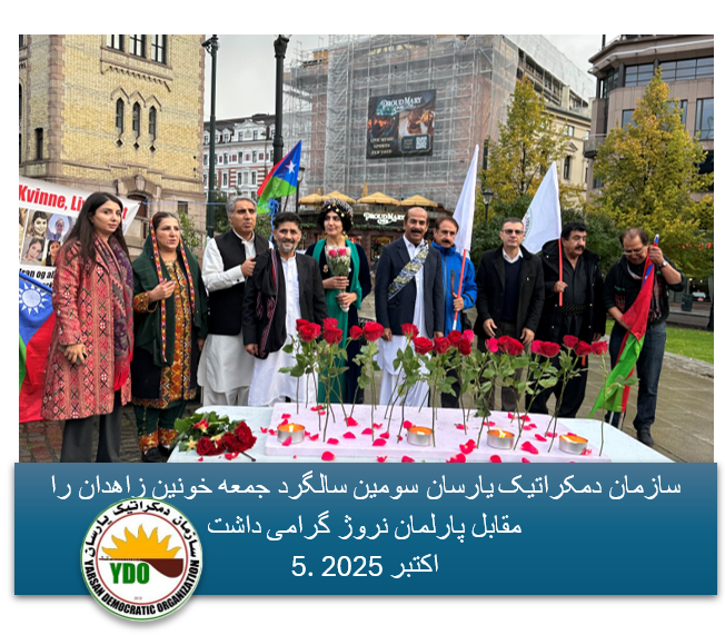 اوسلو – به مناسبت سومین سالگرد «جمعه خونین زاهدان»، سازمان دمکراتیک یارسان روز 5. اکتبر 2025 با حضور جمعی از اعضا و هواداران خود در برابر پارلمان نروژ گردهم آمد. این حضور به دعوت رسمی حزب مردم بلوچستان و کمیته همبستگی بلوچهای نروژ صورت گرفت.
