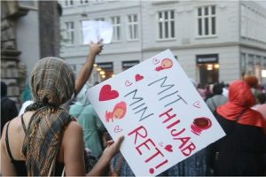 این تصویر مربوط به یکی از تظاهرکنندگان مخالف کشف حجاب در مدارس دانمارک است که اخیرا لایحهاش به پارلمان ارائه شده است.