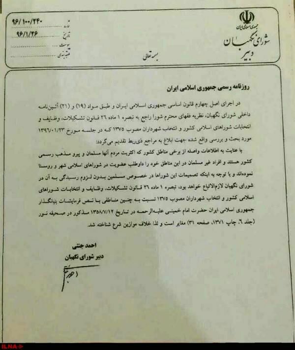 همانطور که مطلع هستید انتخابات دورهی دوازدهم و پنجمین دوره شوراهای شهر و روستا در حال نزدیک شدن است و بعد از اتمام مهلت ثبتنام برای شرکتکنندگان یک ابلاغیه از سوی دبیر شورای نگهبان در مورد جلوگیری از تائید صلاحیت اقلیت های دینی شرکتکننده در انتخابات منتشر شد، مخاطب این ابلاغیه هیئت نظارت بر نامزدهای انتخابات شوراهای شهر و روستا بود اما ازآنجاکه تعیین صلاحیت نامزدهای انتخاباتی شهر و روستا بر عهده شورا نگهبان نیست قبل هر اقدامی از طرف هیئت نظارت، شورای نگهبان با تمامی گروهای اقلیت دینی اتمامحجت کرد و ورود تمامی نامزدهای اقلیت های دینی را در انتخابات را منع نمود. این ابلاغیه با شماره پرونده 240/100/96 و به تاریخ 26/4/96 در روزنامه رسمی جمهوری ایران نیز به چاپ رسید.